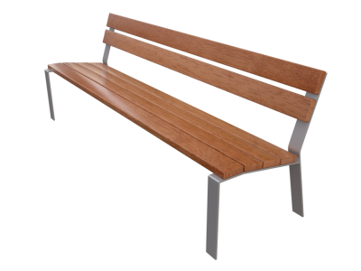 Banco, de 180x70x45 cm com assento e encosto de madeira tropical e corpo estrutural de aço, colocação com bucha química, anilha e parafuso. | ||