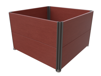 Floreira de 70x70x45 cm, com painéis de resina fenólica de cor castanho e estrutura de perfis de aço com protecção antioxidante e tinta de cor preto.