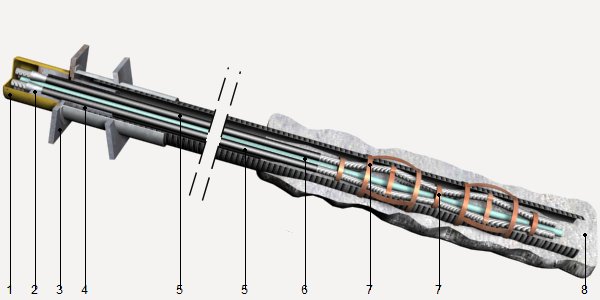 Cabo formado por cordões de aço, de 0,6" (15,2 mm) de diâmetro nominal e 1860 MPa de carga unitária máxima, para ancoragens ao terreno.