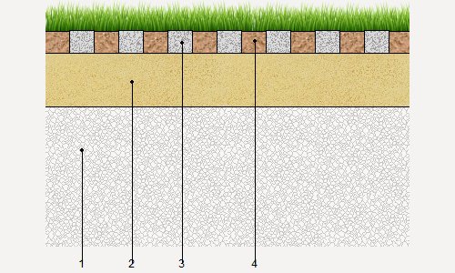 Pavimento drenante, para tráfego pedonal, com uma resistência à flexão-tracção de 3,5 N/mm², uma capacidade drenante de 144 l/(m²·min) e com resistência ao deslizamento maior que 45 segundo ENV 12633, formado por camada de nivelação compactada de areia com granulometria de 0 a 5 mm de diâmetro, limpa, de 5 cm de espessura, peças drenantes pré-fabricadas de betão de 60x40x9,5 cm, cor cinzento, com aberturas preenchidas com gravilha de 5 a 10 mm de diâmetro e camada de enchimento de terra vegetal crivada e mistura de sementes para relva cobrindo a grelha alveolar.