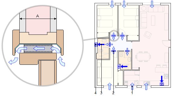 Abertura de passagem para recirculação do ar do interior, dotada de arejador de passagem divisível, telescópico, composto por um elemento central de material fono-absorvente de 60x20 mm de secção e 825 mm de comprimento, com dois perfis superiores telescópicos de PVC, secção 143 cm³, caudal nominal 17,8 l/s e isolamento sonoro de 29 dBA, segundo NP EN ISO 717-1. Colocação por cima da folha da porta, de 725 mm de largura, entre o aro e o pré-aro, em parede divisória desde 60 até 100 mm de espessura.