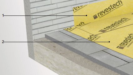 Encontro de cobertura plana acessível, ventilada, com pavimento fixo, tipo convencional com paramento vertical; através da realização de um afastamento perimetral de mais de 5 cm relativamente ao paramento vertical e mais de 20 cm de altura sobre a protecção da cobertura, enchimento com argamassa de cimento, confeccionada em obra, dosificação 1:8 colocada sobre a impermeabilização formada por: banda de acabamento para lâmina impermeabilizante flexível tipo EVAC, Dry Banda 13x30 "REVESTECH", de 127 mm de largura, composta por uma folha dupla de poliolefina termoplástica com acetato de vinil etileno, com ambas as faces revestidas de fibras de poliéster não tecidas, de 0,52 mm de espessura e 335 g/m², fixada à impermeabilização contínua da cobertura, com cimento cola melhorado, deformável e tixotrópico, C2 TE S1, acabamento com um revestimento de rodapés de grés rústico, de 7 cm, 3 €/m colocados com junta aberta (separação entre 3 e 15 mm), em camada fina com cimento cola de presa normal, C1 sem nenhuma característica adicional, cor cinzento e enchimento de juntas com argamassa de juntas cimentosa melhorada, com absorção de água reduzida e resistência elevada à abrasão tipo CG 2 W A, cor branco, para juntas de 2 a 15 mm, formação de ventilação perimetral da caixa de ar com tijolo cerâmico furado e colocação de remate inferior cerâmico de 11x24 cm, fixado ao paramento, como remate da ventilação perimetral da caixa de ar. Inclusive complementos de reforço em tratamento de pontos singulares através da utilização de peças especiais para a resolução de ângulos internos e externos.